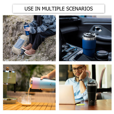 • 18/8 FOOD GRADE STAINLESS STEEL: Tumbler is made of food-grade 304 18/8 stainless steel (including straws), which is rust-free, with no metal after tasting. The splash-proof flip lid and its locking system adopt a double-threaded twist design to ensure the insulation performance of the Coffee Travel mug. They are avoiding popped-off when you are enjoying drinking.