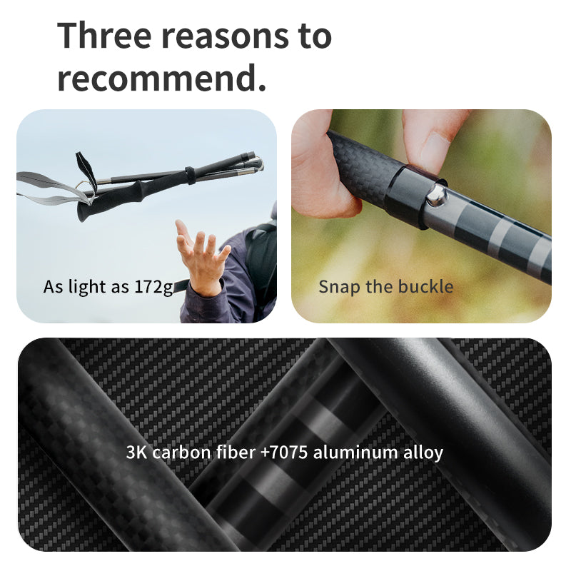 • Featherlight & Durable: The combination of 3K carbon fiber and 7075 aluminum alloy ensures a lightweight yet strong trekking pole.