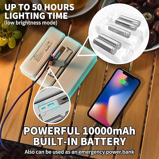• Long-Lasting Battery & Power Bank – Built-in 10000mAh battery provides 2 to 50 hours of light and charges devices in emergencies