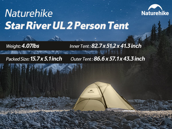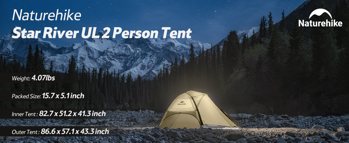 Naturehike Star River UL 2-Person ultralight backpacking tent highlighting its lightweight design, compact pack size, and easy storage for convenient carrying on backpacking and hiking trips.
