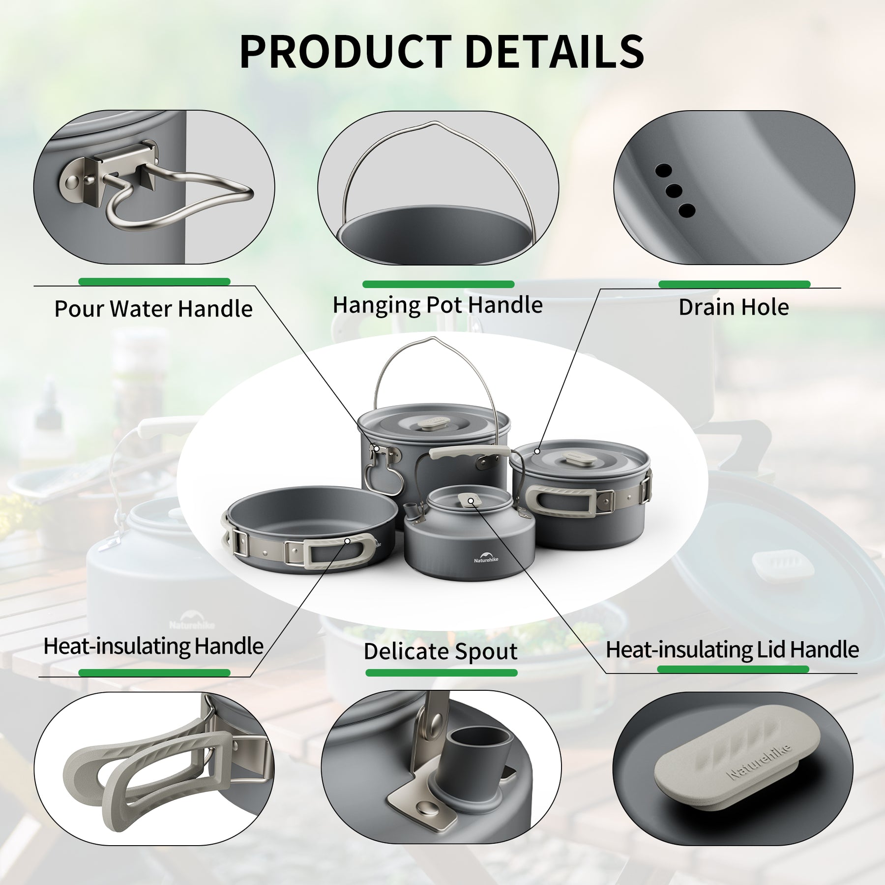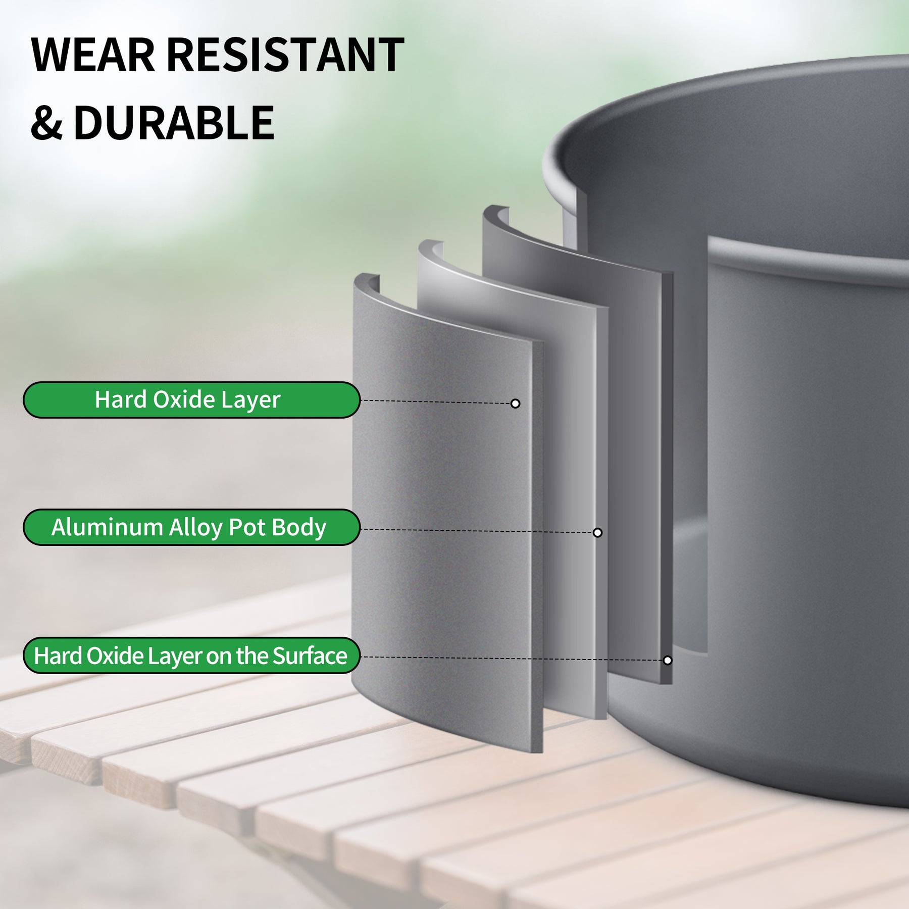 • Lightweight & Portable – Includes a 1.7L pot, 7’’ frying pan, and 1L pot; foldable and stackable design saves backpack space, making it easy to carry and store