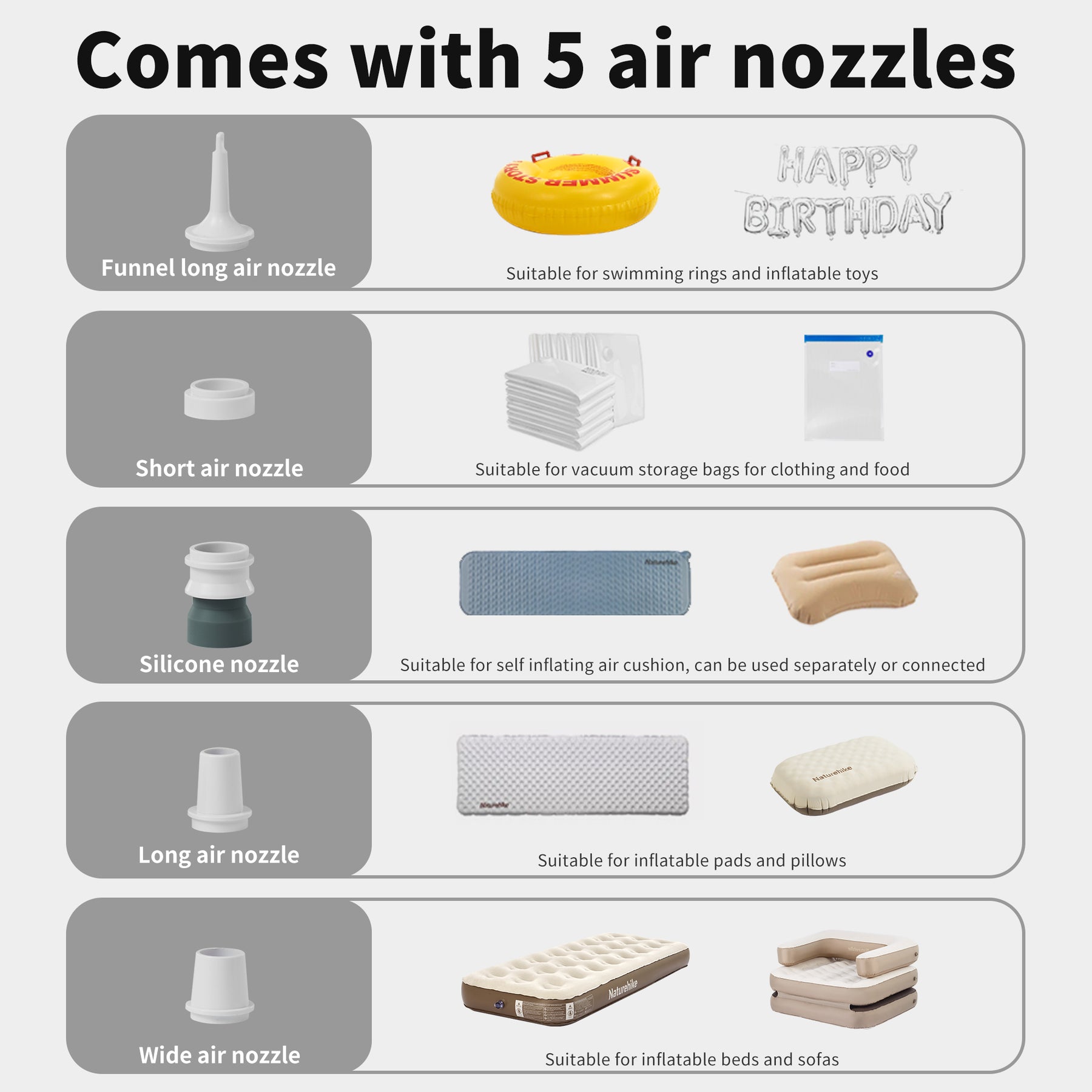 • 5 Interchangeable Nozzles for Versatile Use - Comes with five different nozzles, making it compatible with airbeds, swim rings, cushions, vacuum storage bags, and more for both indoor and outdoor needs.