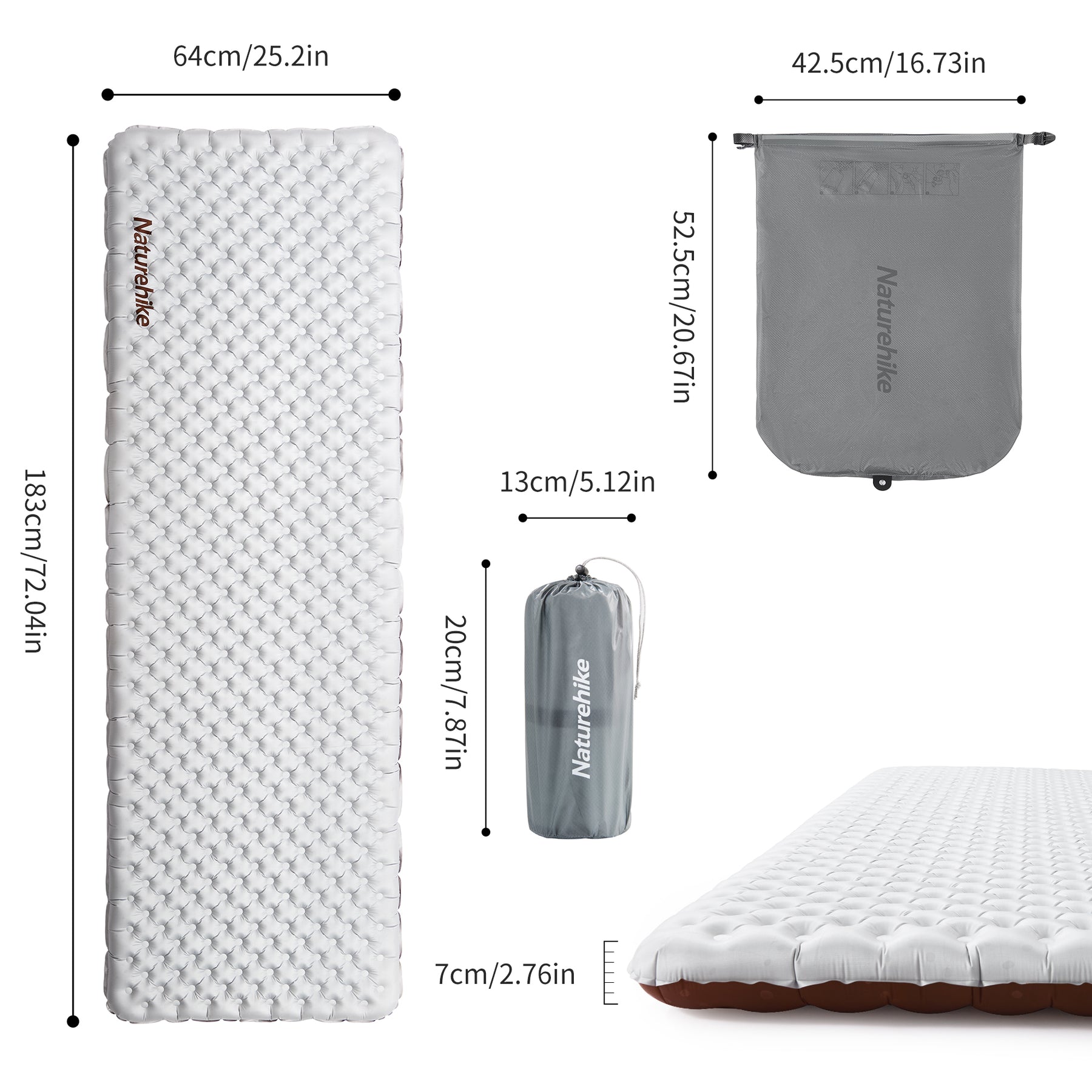 • Quadrato singolo standard: 183*63*7 cm (gonfiato), 20*13*13 cm (imballato), ~600 g (peso).