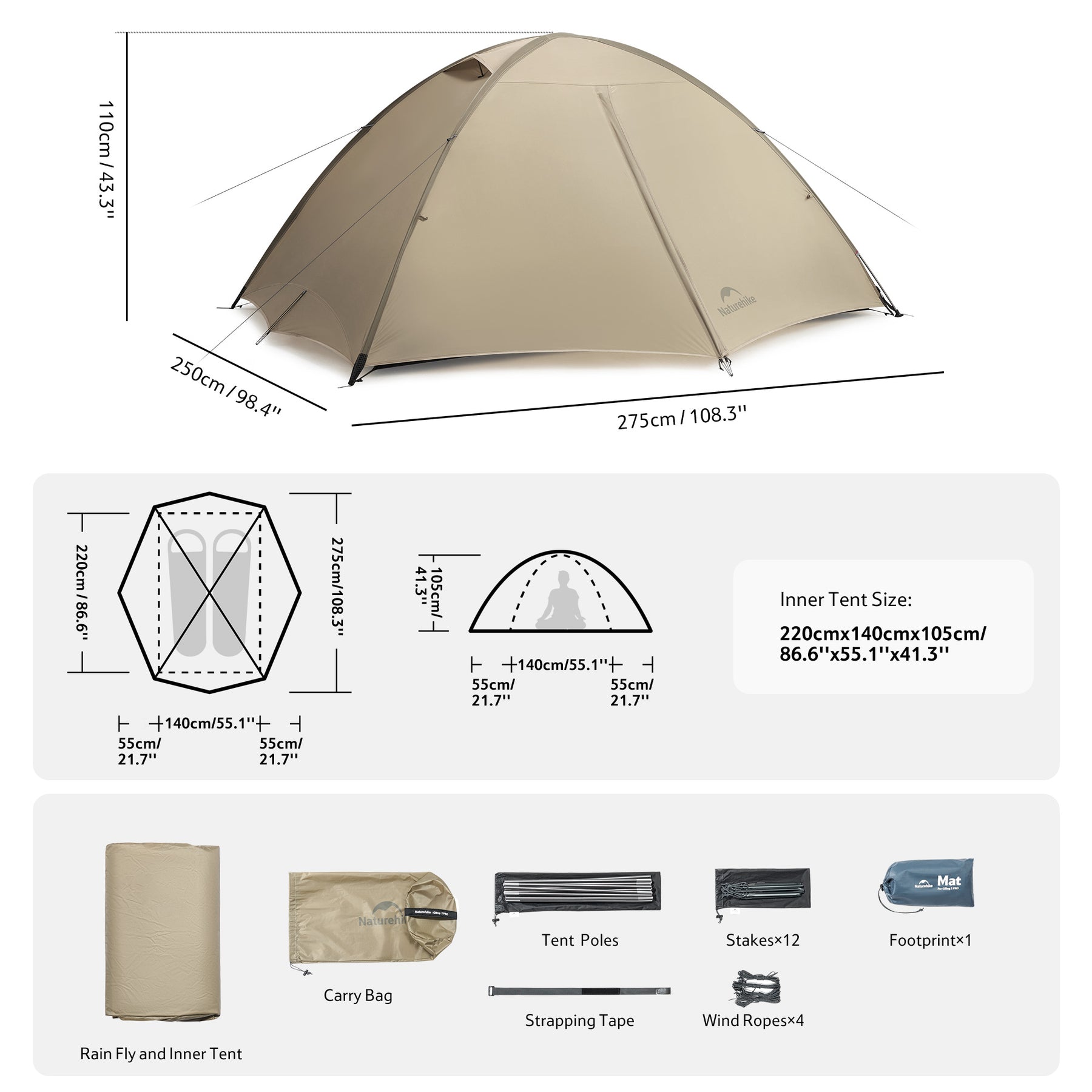 • Outer Tent Size: approx. 275 × 250 × 110 cm / 108.3 × 98.4 × 43.3"