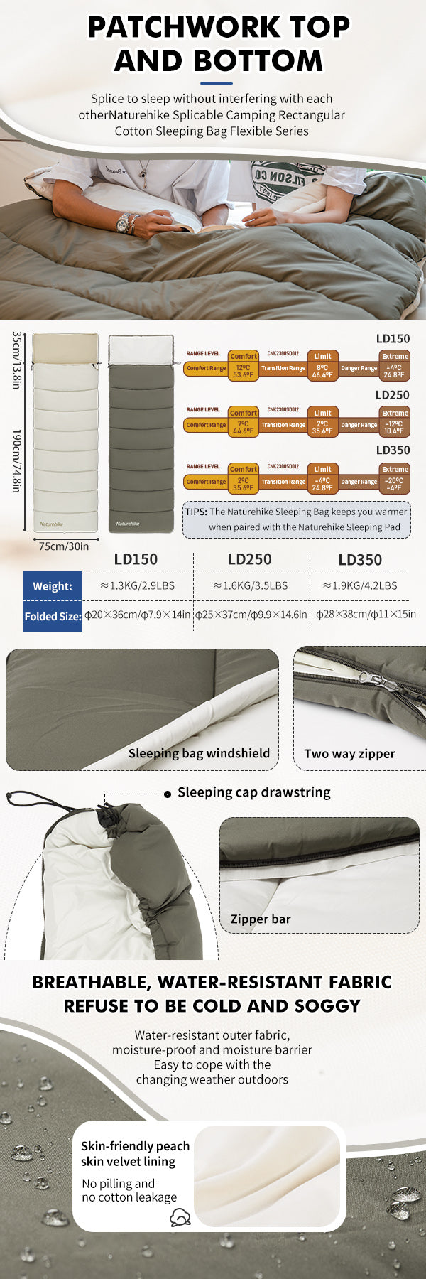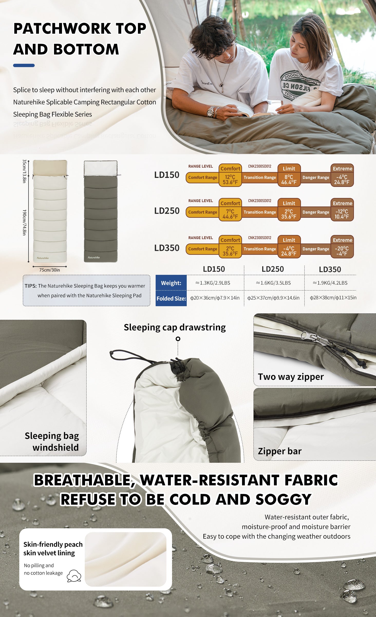 • All-Season Warmth – Available in three thickness options to suit different climates and conditions. The LD250 version supports temperatures from -12°C to 7°C (10.4°F to 44.6°F). Two bags can be zipped vertically together to create a spacious queen-size sleeping area.